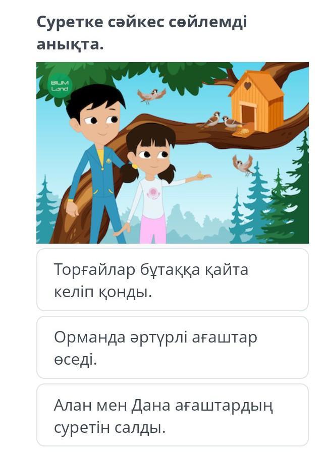 Суретке сәйкес сөйлемді анықта. BILIM Land Торғайлар бұтаққа қайта келіп қонды. Орманда әртүрлі ағаштар өседі. Алан мен Дана ағаштардың суретін салды. Срочноооооооооооо