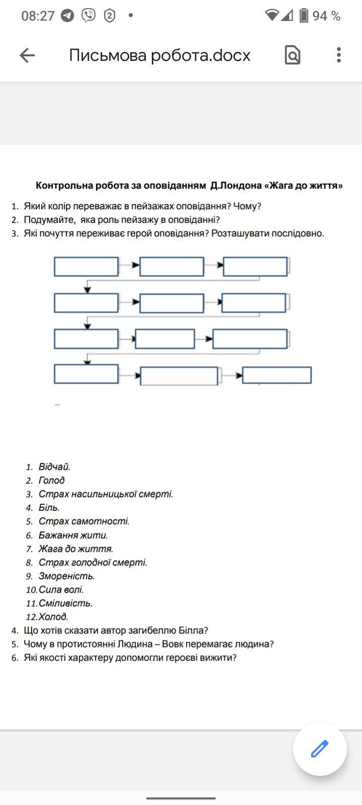 3. змореність, холод, туга, страх, голод, біль, ненависть, відчай, виснаженість, сміливість, бажання жити, спокій, терпіння, сила волі, жага до життя