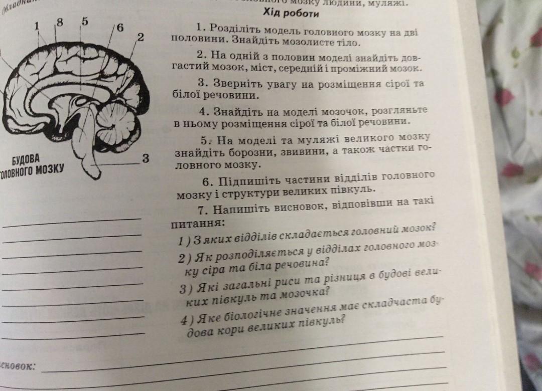 Етапи вивчення моделі мозку включають поділ мозку на дві півкулі та пошук кори головного мозку, таламуса, довгастого мозку та середнього мозку. Зверніть увагу на розподіл сірої та білої речовини в цих частинах мозку. Спостерігайте за борознами та звивинами головного мозку та визначте різні частини мозку та структури великих півкуль. Позначте відділи головного мозку та структури півкуль великого мозку. Підсумовуючи, головний мозок складається з кількох відділів, включаючи кору головного мозку, таламус, довгастий мозок і середній мозок. Сіра і біла речовина розподілені по-різному в цих частинах мозку. Півкулі великого мозку мають чіткі загальні риси та відмінності в будові порівняно зі стовбуром мозку. Складна будова кори великих півкуль головного мозку має біологічне значення.
