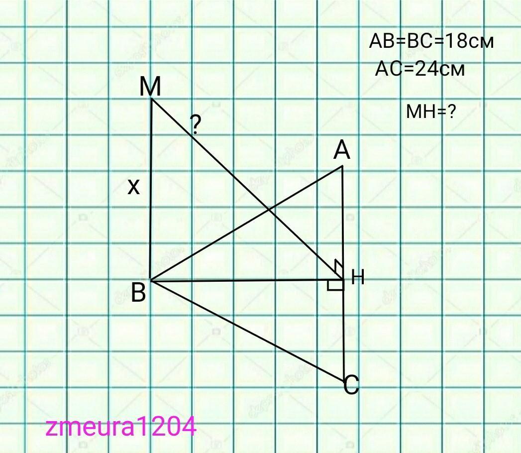 Через вершини в рівнобедреного трикутника АВС (АВ = ВС) проведено пряму ВМ , перпендикулярну до його площини. Обчисліть відстань між прямими ВМ та АС , якщо АВ = 18 см, АС = 24 см.