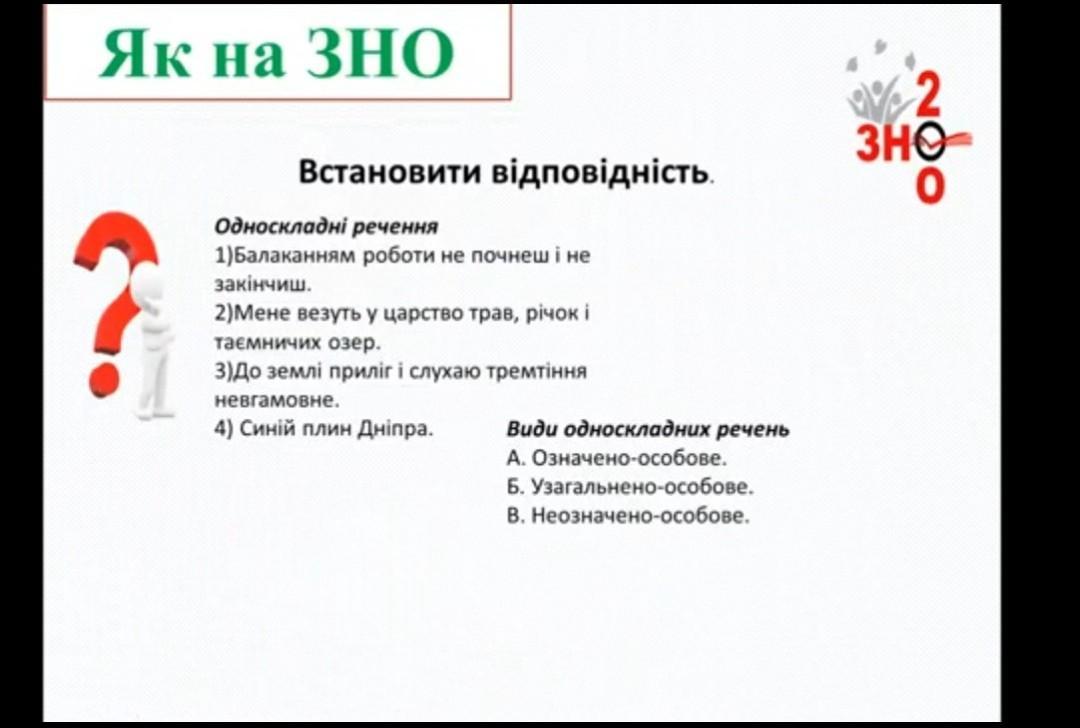 Встановити відповідність. Односкладні речення 1)Балаканням роботи не почнеш і не 2)Мене везуть у царство трав, річок і закінчиш. таємничих озер. 3)До землі приліг і слухаю тремтіння невгамовне. 4) Синій плин Дніпра. Види односкладних речень A. Означено-особове. Б. Узагальнено-особове. в. Неозначено-особове.