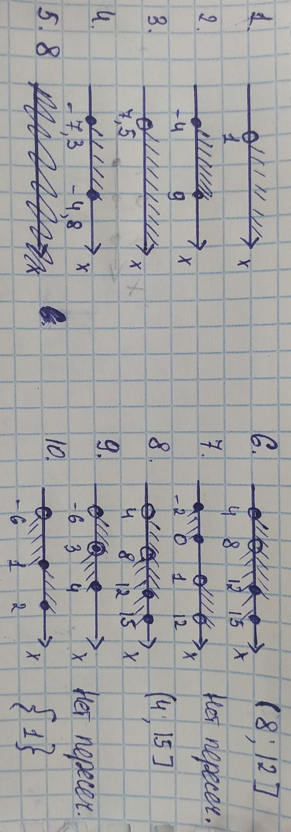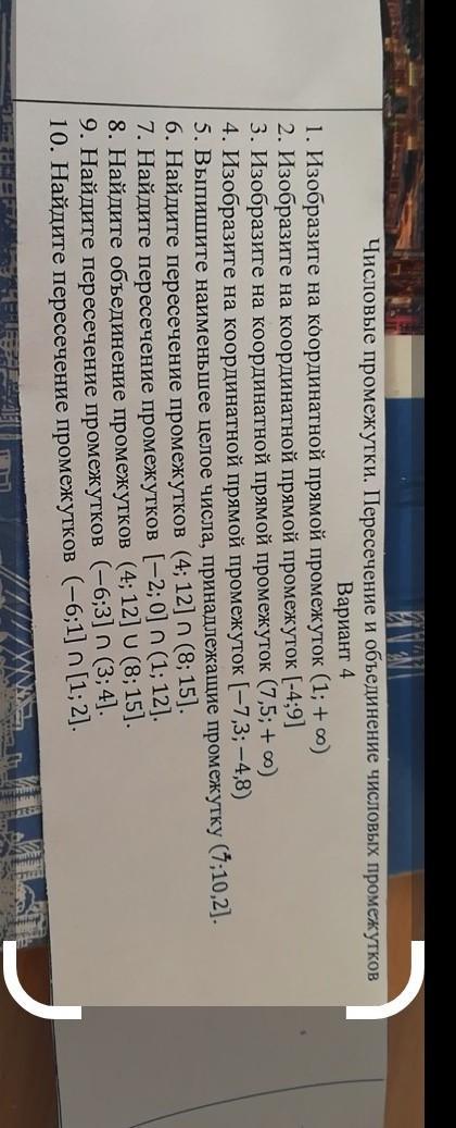 1. Изобразите на координатной прямой промежуток (1; ∞) 2. Изобразите на координатной прямой промежуток [-4;9] 3. Изобразите на координатной прямой промежуток (7, 5; ∞) 4. Изобразите на координатной прямой промежуток lceil-7,3; - 4, 8 ) 6. Найдите пересечение промежутков (4; 12) (8; 15]. 9. Найдите пересечение промежутков - 6; 3 ] cap(3;4 rfloor. 10. Найдите пересечение промежутков (-6;1] n [1; 2]. (7;10 7. Найдите пересечение промежутков [-2; 0] n (1; 12]. 8. Найдите объединение промежутков (4;12 rfloor cup (8; 15] 5. Выпишите наименьшее целое числа, принадлежащоие СРОЧНО ДАМ ВСЕ БАЛЛЫ И ПОДПИШУСЬ ДАМ ЛУЧШИЙ ОТВЕТ промежуткую