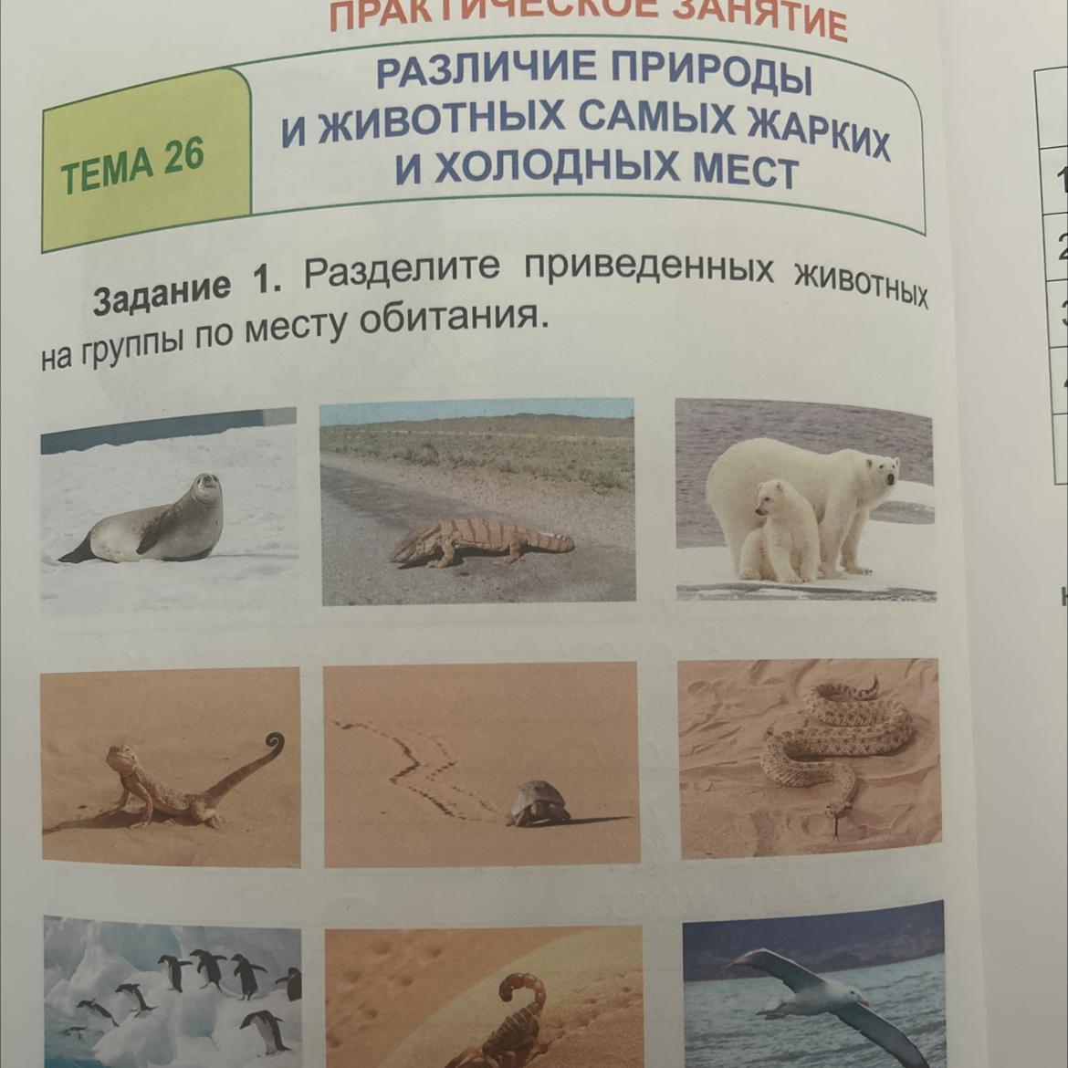 разделите приведенных животных на группы по месту обитания и напишите какие животные изображены на картинке?