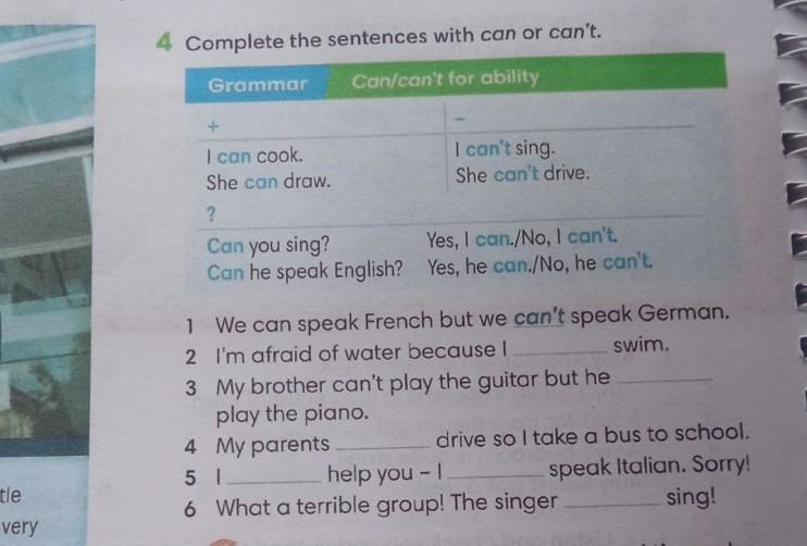 4 Complete the sentences with can or can't. Can/can't for ability 1 2 3 Grammar + I can cook. She can draw. ? Can you sing? Can he speak English? I can't sing. She can't drive. Yes, I can./No, I can't. Yes, he can./No, he can't. We can speak French but we can't speak German. I'm afraid of water because I My brother can't play the guitar but he play the piano. swim. 4 My parents 5 1 help you - I 6 What a terrible group! The singer drive so I take a bus to school. speak Italian. Sorry! sing! d the vorb