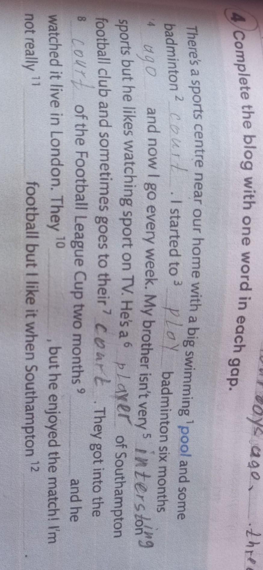 5 keen 6 supporter/fan 7 match/game 8 final 9 ago 10 lost 11 into 12 wins/plays