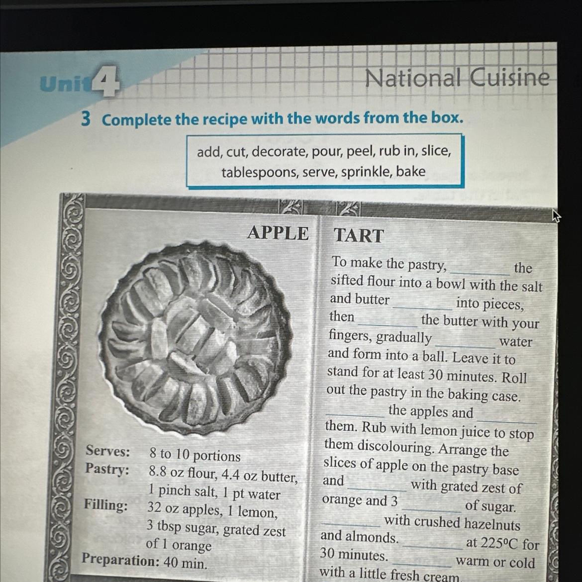 ВОТ ТОЧНО ПРАВИЛЬНО: pour, slice, rub in, add, peel, cut, decorate, tablespoons, sprinkle, bake,