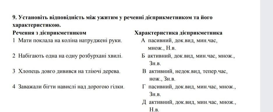 9. Установіть відповідність між ужитим у реченні дієприкметником та його характеристикою. Речення з дієприкметником 1 Мати поклала на на натружені руки. 2 Набiгають одна на одну розбурхані хвилі. 3 Хлопець довго дивився на тліючi дерева. 4 Заважали бігти навислi над дорогою гілки. Характеристика дієприкметника А пасивний, док.вид, мин.час, множ., Н.В. Б активний, док.вид, мин.час, множ., Зн.в. В активний, недок.вид, тепер.час, нож., Зн.в. Г пасивний, док.Вид, мин.час, множ., Зн.в. Д активний, док.вид, мин.час, множ., Н.В.