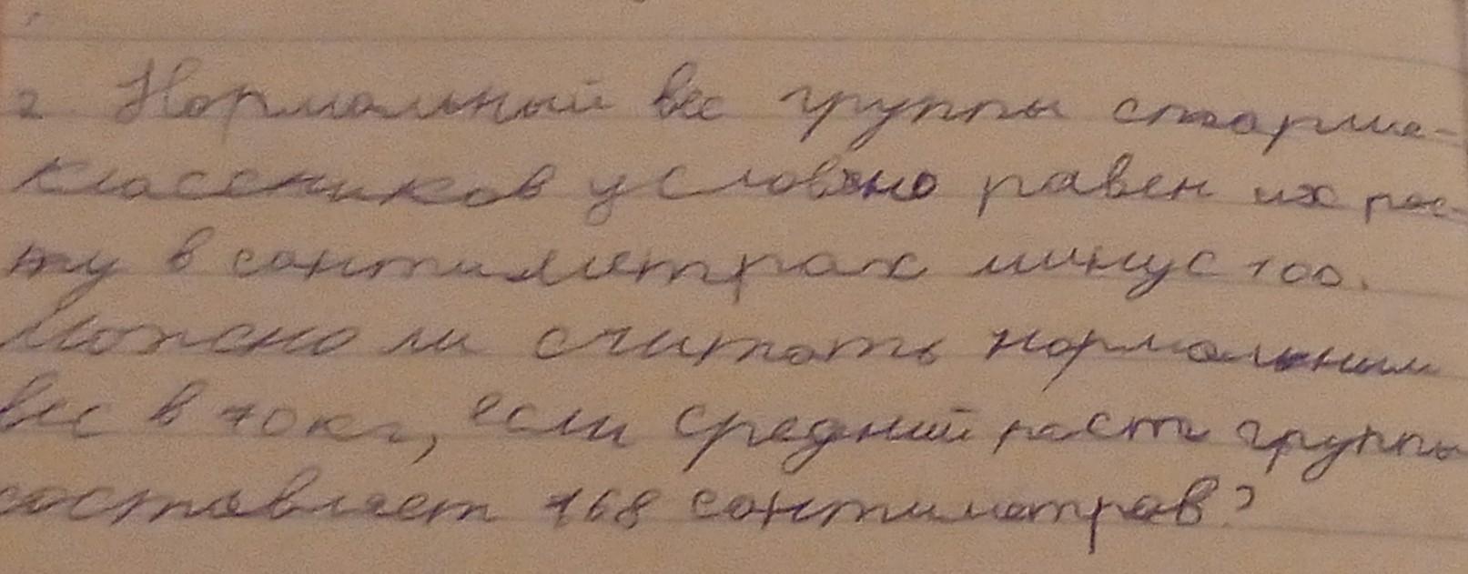 нормальный вес группы старшеклассников условно равен их росту в сантиметрах минус 100. Можно ли считать нормальным вес 70 кг, если средний рост группы составляет 168 сантиметров?