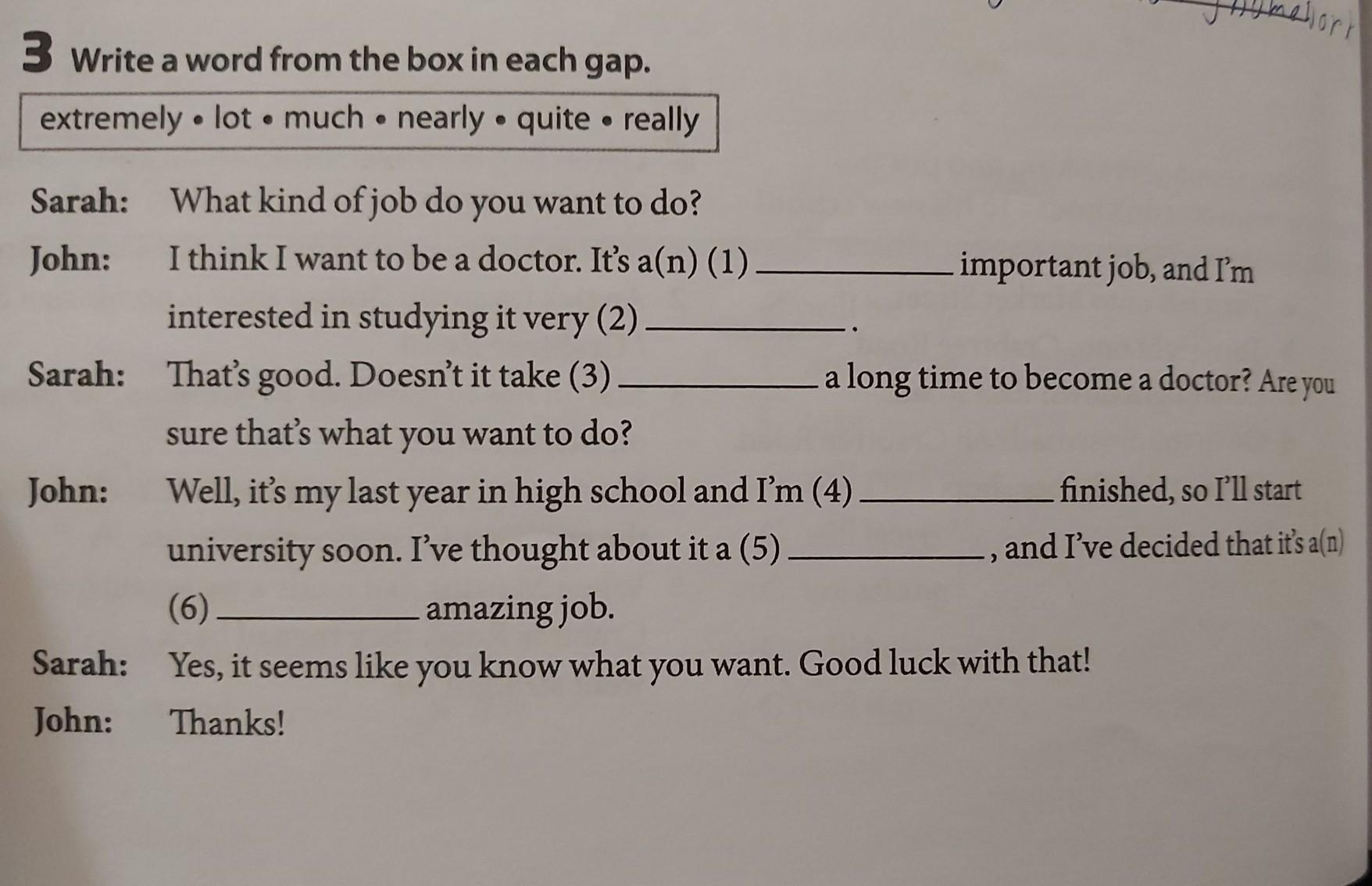 18 3 Write a word from the box in each gap. extremely lot much ● nearly quite really John: ● Sarah: What kind of job do you want to do? John: I think I want to be a doctor. It's a(n) (1). interested in studying it very (2) - Sarah: That's good. Doesn't it take (3). sure that's what you want to do? Sarah: John: ● got to do by homellort Well, it's my last year in high school and I'm (4). university soon. I've thought about it a (5) important job, and I'm - a long time to become a doctor? Are you finished, so I'll start -, and I've decided that it's a(n) (6) _____ amazing job. Yes, it seems like you know what you want. Good luck with that! Thanks!