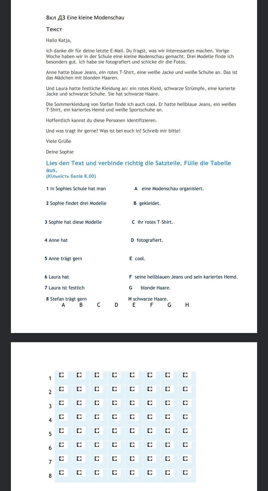 Lies den Text und verbinde richtig die Satzteile. Fülle die Tabelle aus. (Кількість балів 8.00) 1 In Sophies Schule hat man 2 Sophie findet drei Modelle 3 Sophie hat diese Modelle 4 Anne hat 5 Anne trägt gern 6 Laura hat 7 Laura ist festlich 8 Stefan trägt gern A A eine Modenschau organisiert. B gekleidet. C ihr rotes T-Shirt. D fotografiert. E cool. F seine hellblauen Jeans und sein kariertes Hemd. G blonde Haare. H schwarze Haare. F G B C D E H