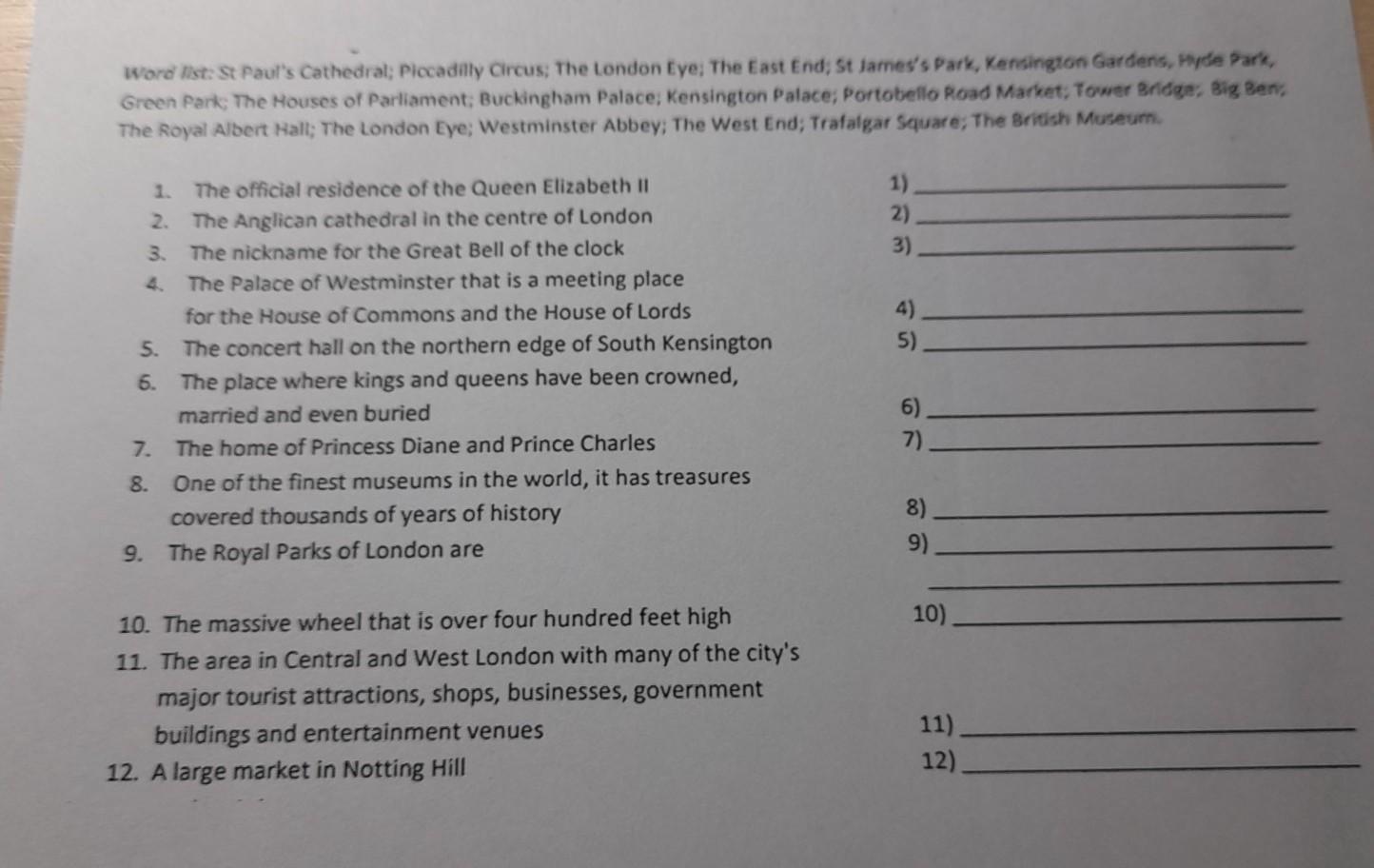 Word list: St Paul's Cathedral; Piccadilly Circus; The London Eye; The East End; St James's Park, Kensington Gardens, Hyde Park, Green Park; The Houses of Parliament; Buckingham Palace; Kensington Palace; Portobello Road Market; Tower Bridge: Big Ben; The Royal Albert Hall; The London Eye; Westminster Abbey; The West End; Trafalgar Square; The British Museum. 1. The official residence of the Queen Elizabeth II 2. The Anglican cathedral in the centre of London 3. The nickname for the Great Bell of the clock The Palace of Westminster that is a meeting place for the House of Commons and the House of Lords The concert hall on the northern edge of South Kensington The place where kings and queens have been crowned, married and even buried 4. 5. 6. The home of Princess Diane and Prince Charles One of the finest museums in the world, it has treasures covered thousands of years of history 9. The Royal Parks of London are 7. 8. 10. The massive wheel that is over four hundred feet high 11. The area in Central and West London with many of the city's major tourist attractions, shops, businesses, government buildings and entertainment venues 12. A large market in Notting Hill 1) 2). 3). 4). 5) 6) 7). S). 9) 10) 11)_ 12)_