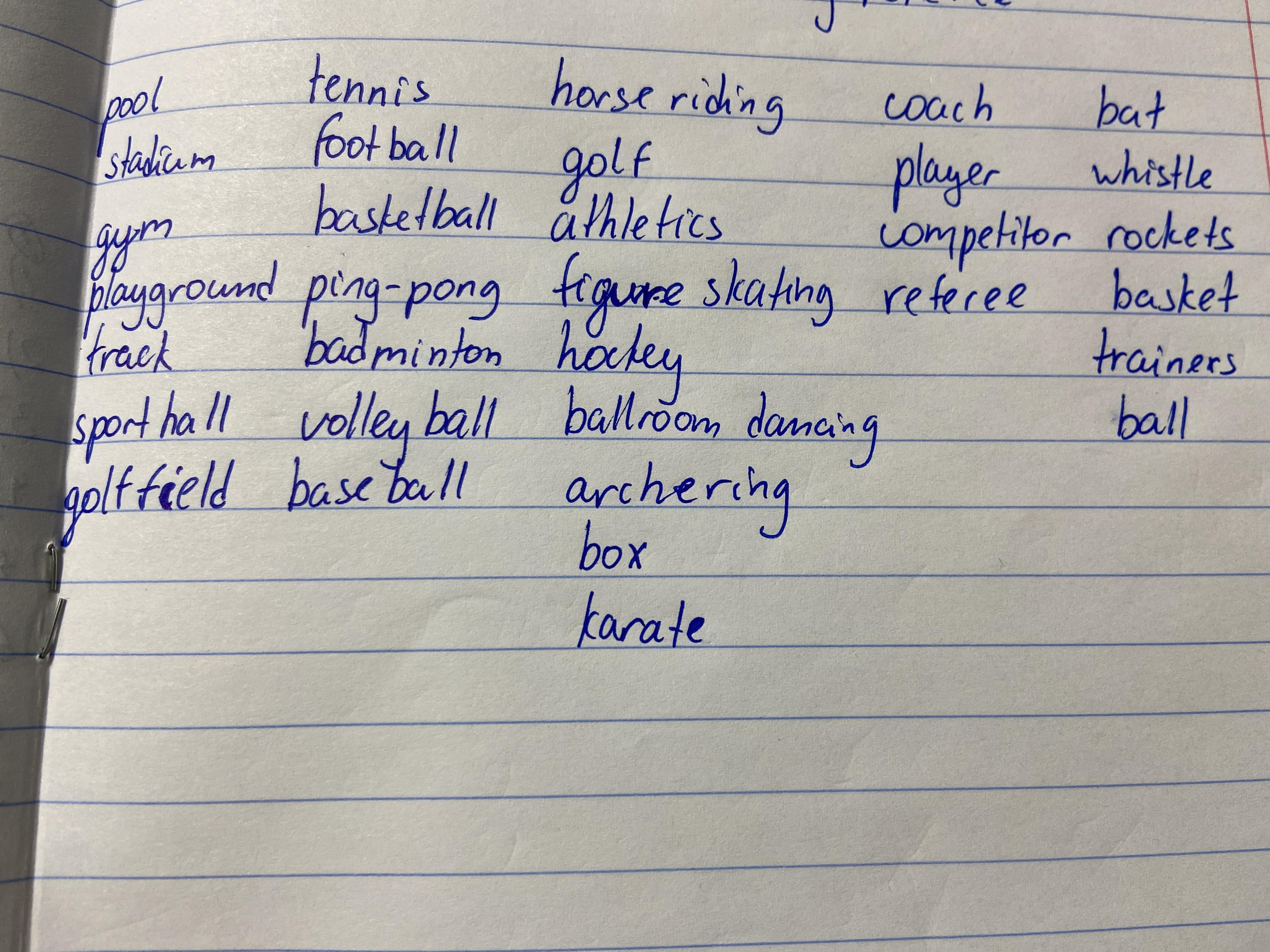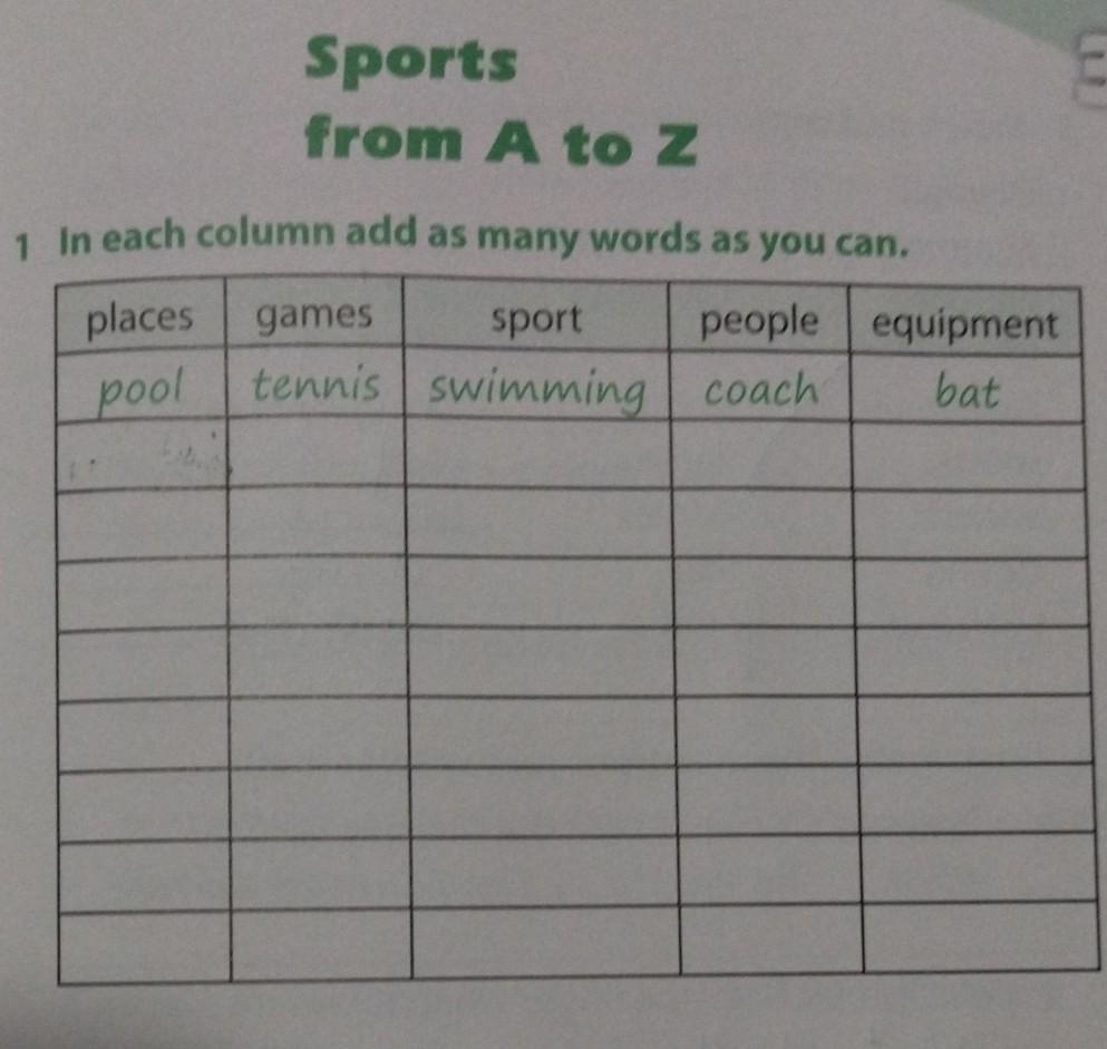 1 In each column add as many words as you can. sport swimming coach places games pool tennis people equipment bat