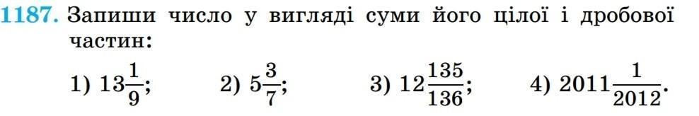 запиши число у вигляді суми його цілої і дробової частини. 13 1/9 5 3/7 12 135/136 2011 1/2012