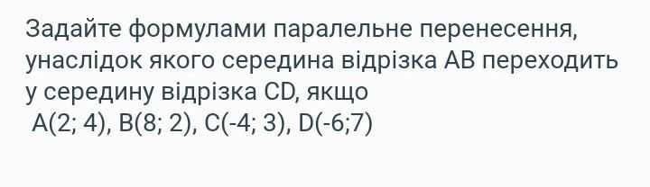 Унаслідок повороту навколо початку координат на кут 90° за годинниковою стрілкою та наступного паралельного перенесення, заданого формулами x'=x+2, y'=y-1, відрізок АВ перейшов у відрізок CD. Визначте координати точок С і D, якщо A(2; 3), В(6; 9).