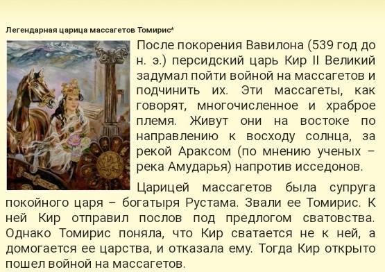 В сражении был убит и Кир. Повод для войны был достаточным, персы начали переправу через реку. Томирис погрузила голову Кира в кожаный мешок.Кир углубился в земли саков и расположился лагерем. Для преследования врага Томирис направила треть своего войска во главе с единственным сыном, юным Спаргаписом. Заняв лагерь персов, саки, пользуясь неопытностью своего полководца, принялись пировать. Летом 530 г. до н.э. подойдя к пограничной с территорией саков реке, Кир через послов по сватался к вдове Томирис. Томирис отправила к царю посла с требованием покинуть страну и вернуть ей останки сына. В двух ожесточенных сражениях саки-тиграхауда наголову разбили персов. Согласно другой версии, саки заманили персов в ущелье, где полностью уничтожили их двухсоттысячную армию. Спаргапис пал в побоище, по другой - был взят в плен, не вынес позора и покончил с собой. РАСТАВЬ В ХРОНОЛОГИЧЕСКОЙ ПОСЛЕДОВАТЕЛЬНОСТИ (40Б)