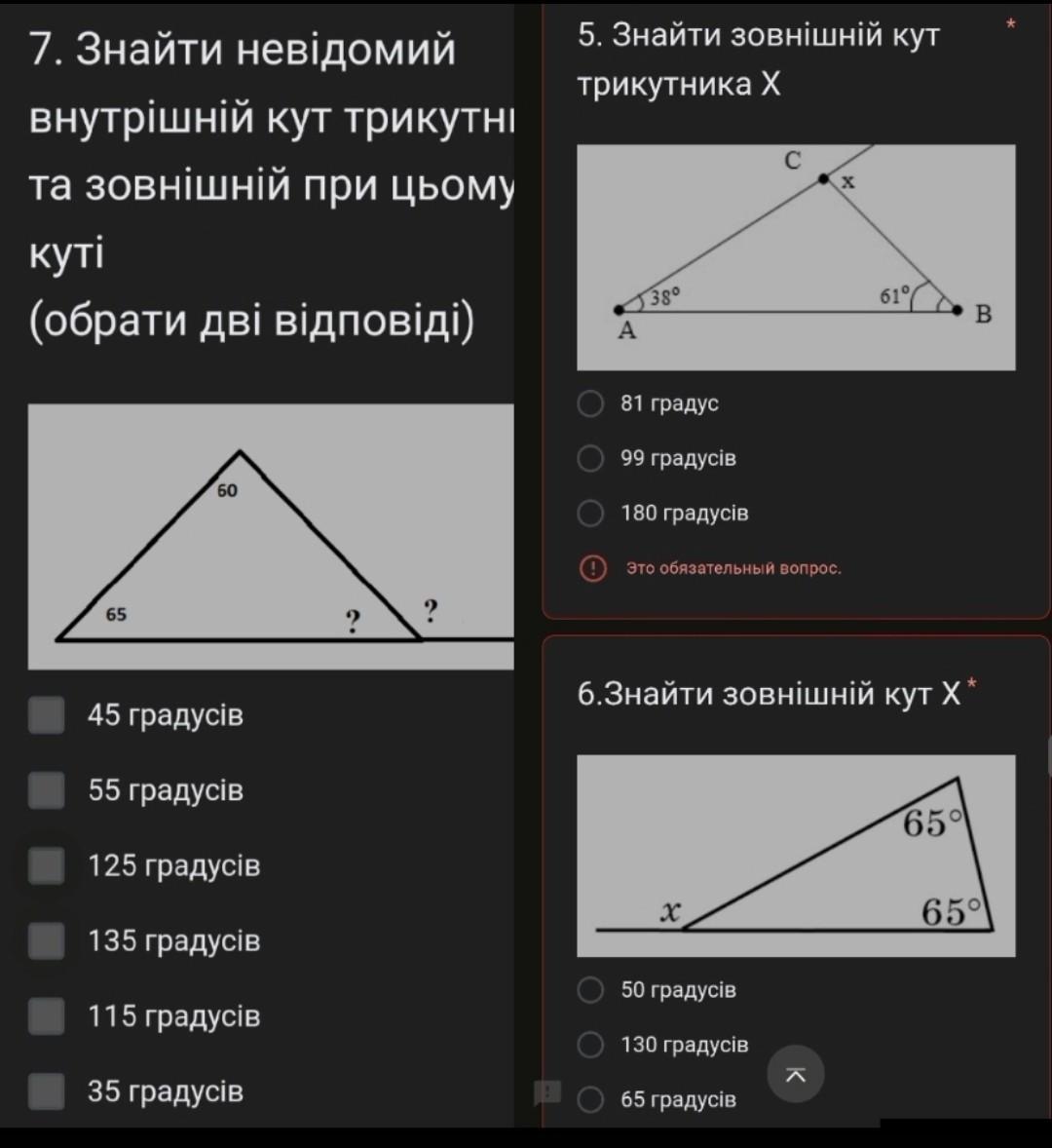В первом задании:внешнийВнутренний 55°,внешний равен сумме двух внутренних углов не смежных с ним,т.е 125°