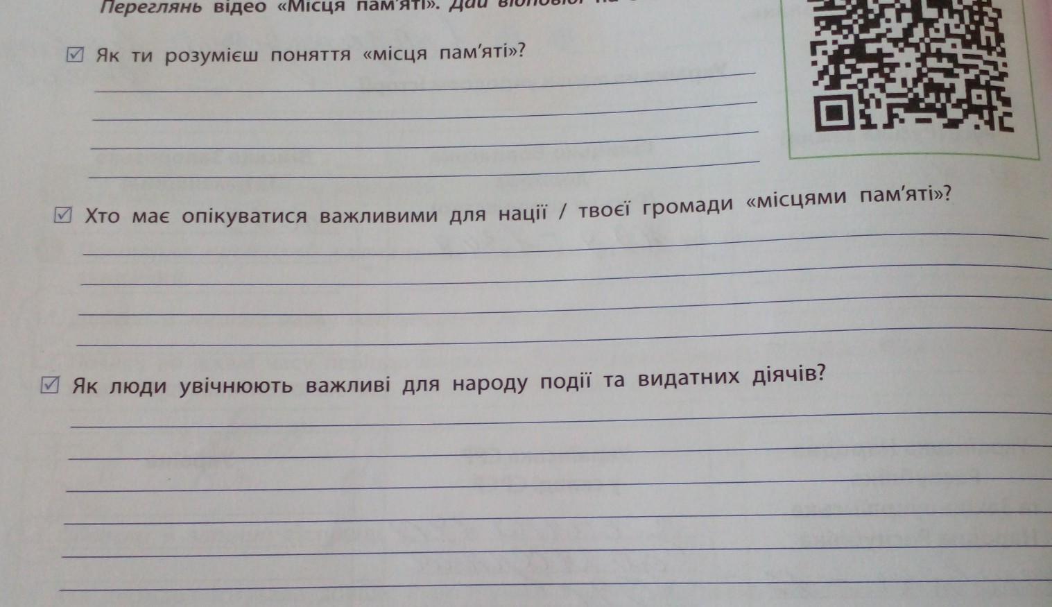 Як ти розумієш поняття "місця пам'яті"? Місце, з яким певна група людей пов'язує свої спогади, цінності. Хто має опікуватися важливими для нації/ твоєї країни громади "місцями пам'яті"? Патріот своєї країни. Як люди увічнюють важливі для народу події та видатних діячів? Для увічнення пам'яті про історичні події та людей, котрі брали в них участь, споруджують пам'ятники. їх також споруджують на честь видатних діячів історії, культури, державотворення.