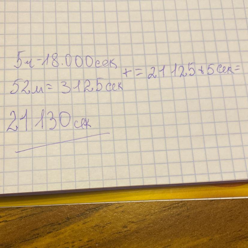 5 часов 52 минуты 5 сек = 5 * 3600 + 52 * 60 + 5 = 21125 сек.