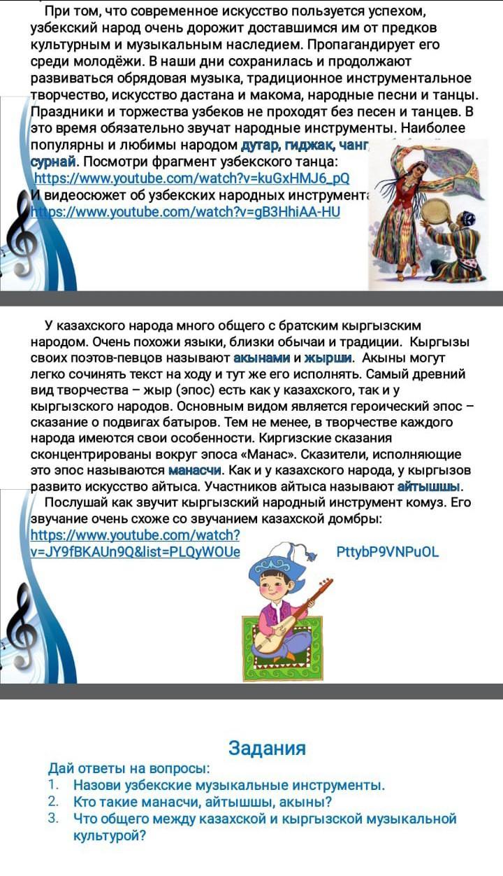 Задания Дай ответы на вопросы: 2. 1. Назови узбекские музыкальные инструменты. Кто такие манасчи, айтышшы, акыны? Что общего между казахской и кыргызской музыкальной культурой? 3.