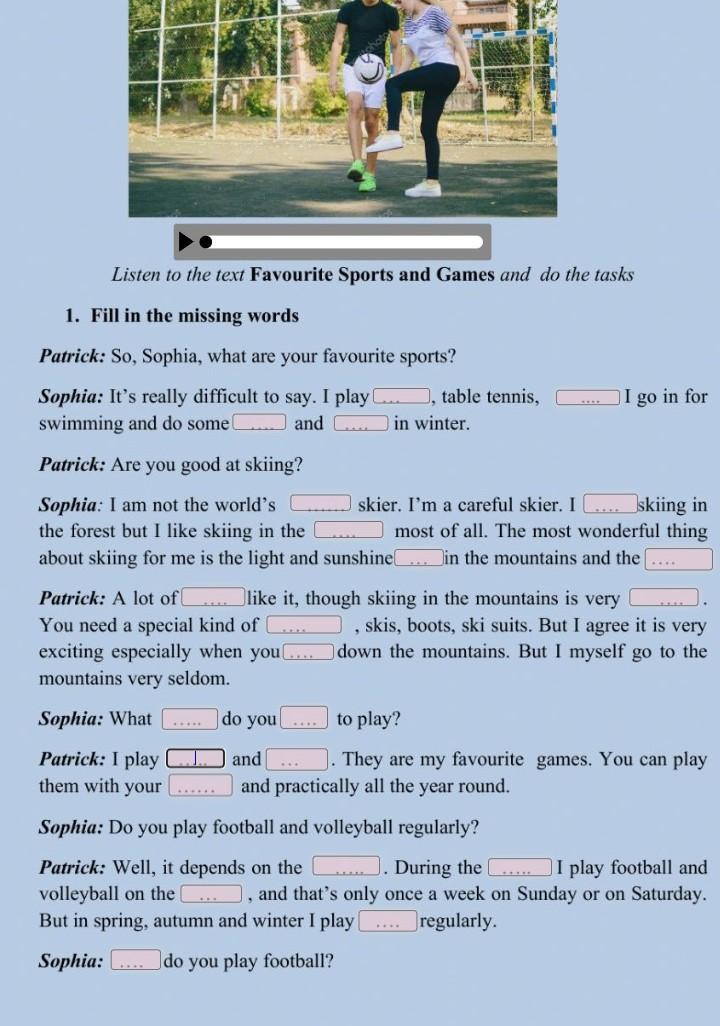1. Fill in the missing words Patrick: So, Sophia, what are your favourite sports? Sophia: It's really difficult to say. I play ..., table tennis, swimming and do some in winter. and .... Patrick: Are you good at skiing? Sophia: I am not the world's skier. I'm a careful skier. I .... skiing the forest but I like skiing in the most of all. The most wonderful thi about skiing for me is the light and sunshine... in the mountains and the Patrick: A lot of You need a special kind of .. exciting especially when you.... mountains very seldom. Sophia: What Patrick: I play them with your ***** WORKSHEETS like it, though skiing in the mountains is very I go in **** LLLL , skis, boots, ski suits. But I agree it is ve down the mountains. But I myself go to t ..... do you to play? and They are my favourite games. You can pl and practically all the year round. Sophia: Do you play football and volleyball regularly? Patrick: Well, it depends on the ...... During the ..... I play football a volleyball on the ..., and that's only once a week on Sunday or on Saturda But in spring, autumn and winter I play regularly. Sophia: do you play football? пж пожалуйста пж даю 100балов