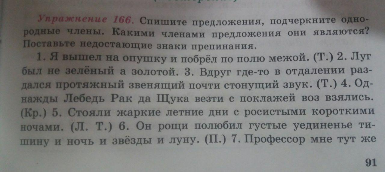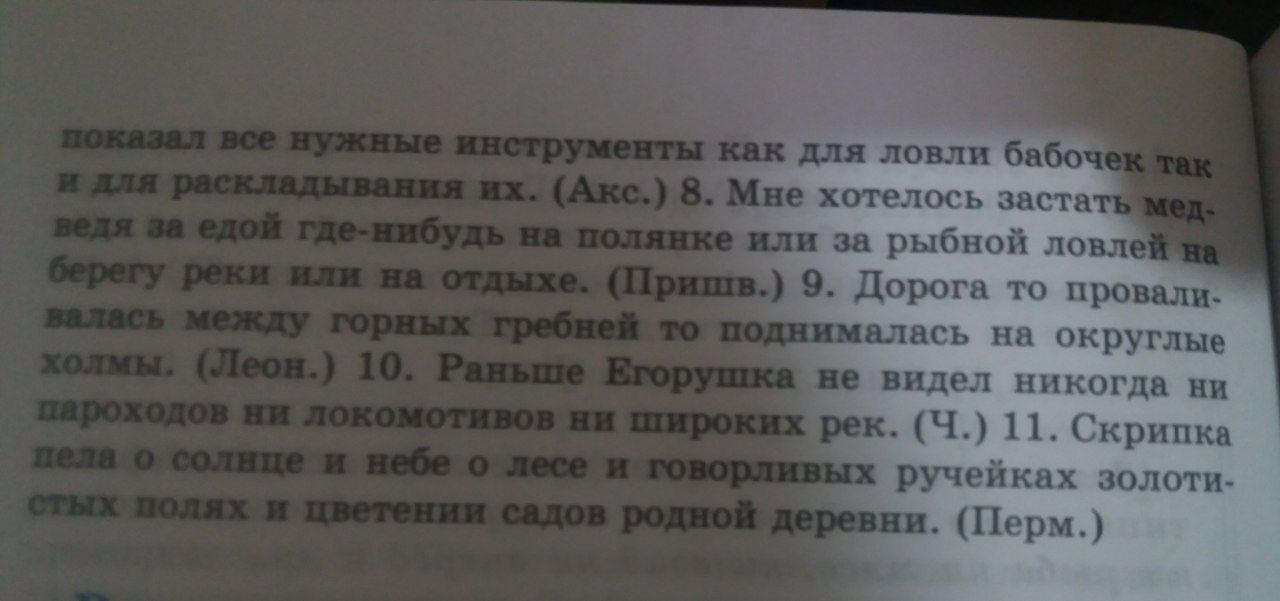 1. Я вышел на опушку и побрел на полю межой(однородные сказуемые =). 2. Луг был не зеленый, а золотой (однородные определения). 3 Вдруг где-то в отдалении раздался протяжный звенящий, почти стонущий ( однородные определения) звук. 4 Однажды Лебедь, Рак да Щука (однородные подлежащие) везти с поклажей воз взялись. 5 Стояли черные, жаркие, летние (однородные определения) дни, с росистыми короткими (однородные определения)ночами . 6 Он рощи полюбил густые, уединенье, тишину и ночь и звезды и луну( однородные дополнения). 7 Профессор мне тут же показал все нужные инструменты: как для ловли бабочек, так и для раскладывания (однородные дополнения)их. 8 Мне хотелось застать медведя за едой где-нибудь на полянке, или за рыбной ловлей на берегу реки или на отдыхе (однородные обстоятельства). 9 Дорога то проливалась между горных гребней, то поднималась на округлые холмы однородные сказуемые). 10 Раньше Егорушка не видел никогда ни пароходов, ни локомотивов, ни широких рек (однородные дополнения). 11 Скрипка пела о солнце и небе, о лесе и говорливых ручейках, золотистых полях и цветении садов роднойдеревни (однородные дополнения).