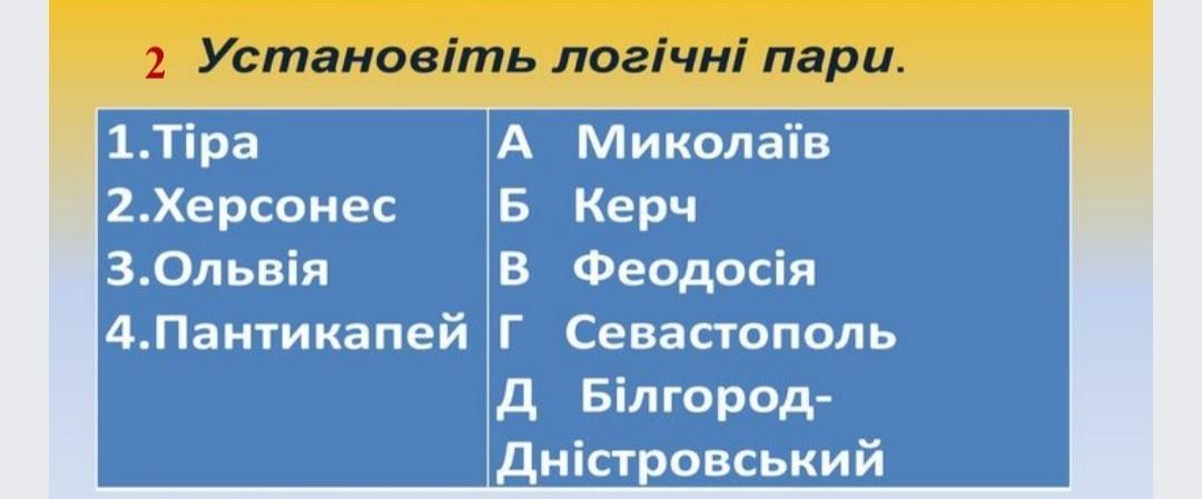2 Установіть 1.Tipa 2.Херсонес 3.Ольвія 4.Пантикапей логічні пари. А Миколаїв Б Керч в Феодосія Г Севастополь Д Білгород- Дністровський ПОМОГИТЕ ПОЖАЛУЙСТА
