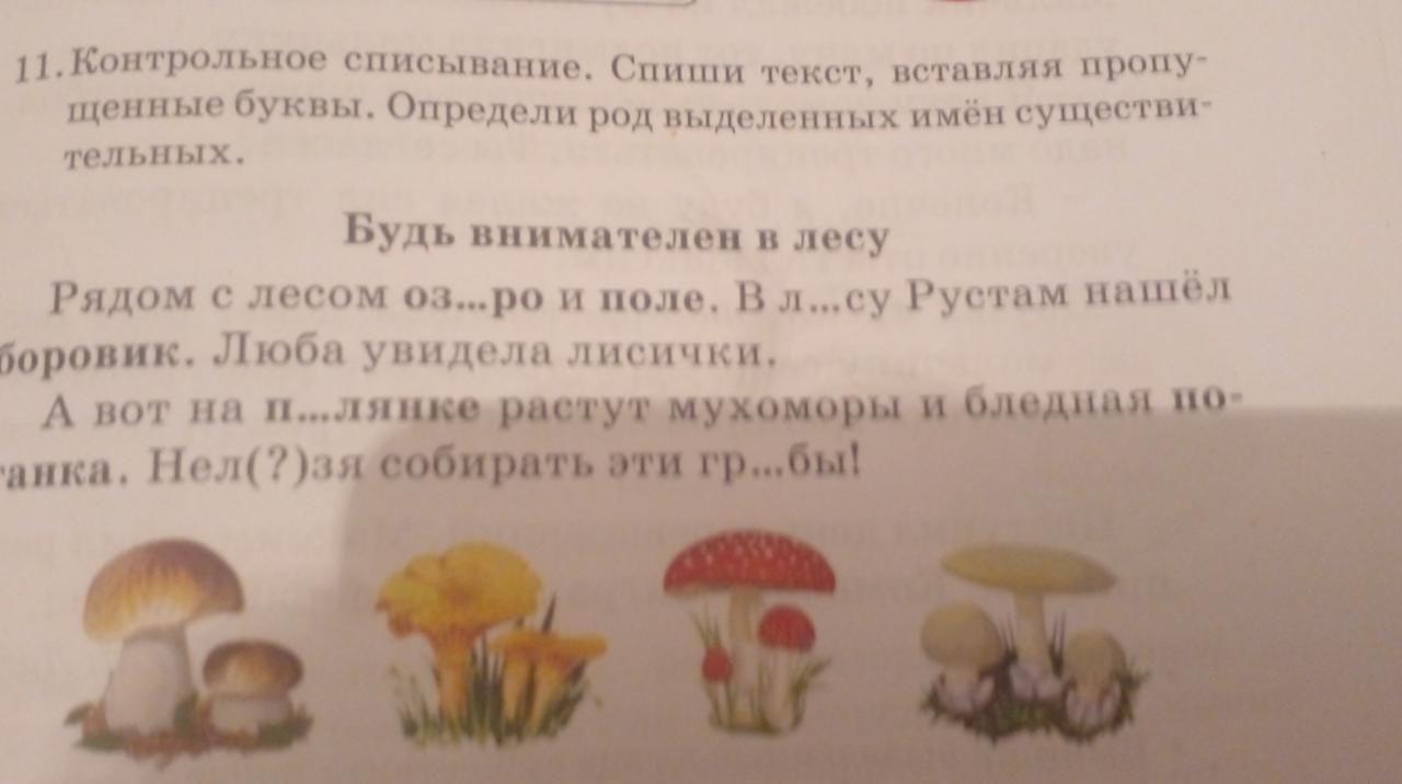 11. Контрольное списывание. Спиши текст, вставляя пропу- щенные буквы. Определи род выделенных имён существи- тельных. Будь внимателен в лесу Рядом с лесом оз...ро и поле. В л...су Рустам нашёл боровик. Люба увидела лисички. А вот на п...лянке растут мухоморы и бледная по- -анка. Нел(?)зя собирать эти гр.... бы!