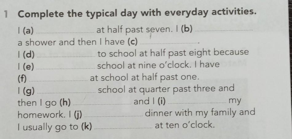 I wake up at half past seven. I take a shower and then I have breakfast. I go to school at half past eight because I come to school at nine o'clock. I have lunch at school at half past one.