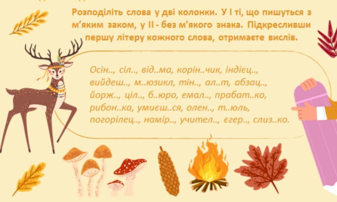 I колонка - осінь, сіль, відьма, індієць, тінь, альт, ціль, емаль, прабатько, рибонька, олень, погорілець, учитель, слизько.