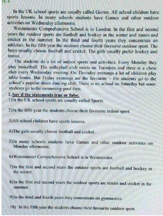 1.Say if the statements true or false. 1)In the UK school sports are usually called Sports. 2)In the fifth year the students choose their favourite indoor sport 3)All school children have sports lessons. 4)The girls usually choose football and cricket. 5) In many schools students have Games and other outdoor activities on Monday afternoons. 6) Westminster Comprehensive School is in Westminster. 7) In the first and second years the outdoor sports are football and hockey in the winter. 8) In the first and second years the outdoor sports are tennis and cricket in the summer 9) In the third and fourth years they concentrate on gymnastics. 10) In the fifth year the students choose their favourite outdoor sport.