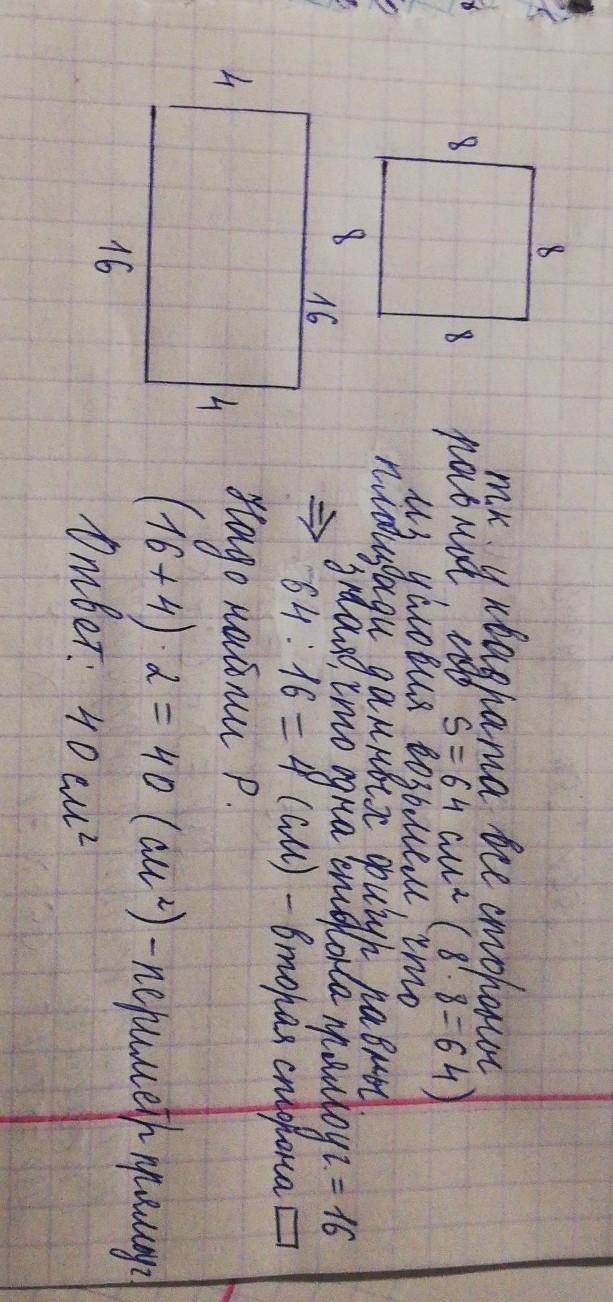 Прямоугольник и квадрат имеют равные площади. Сторона квадрата 8см, одна из сторон прямоугольника 16см. найти периметр прямоугольника.