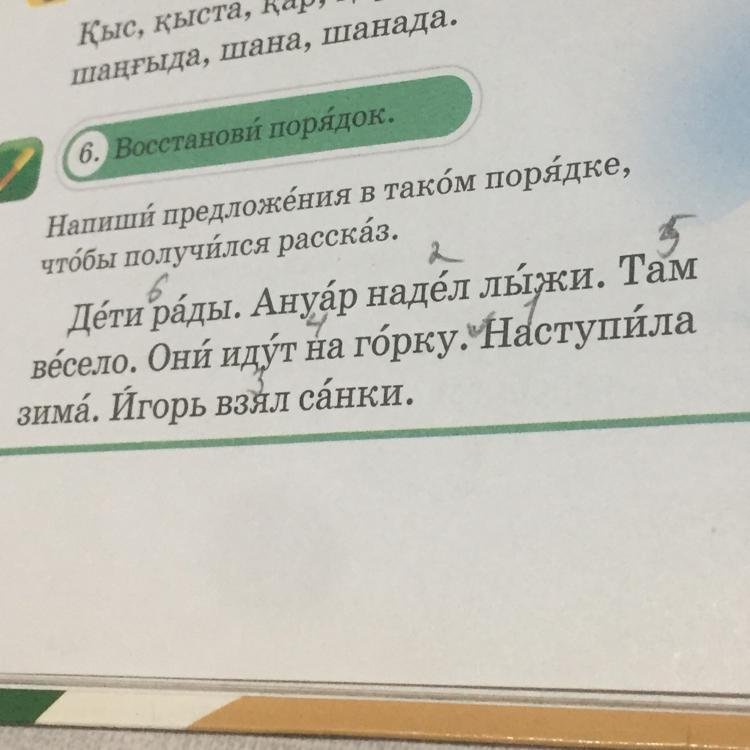 Ответ:Наступила зима. Ануар надел лыжи, а Игорь взял санки. Они пошли на горку. Там весело, и дети этому рады
