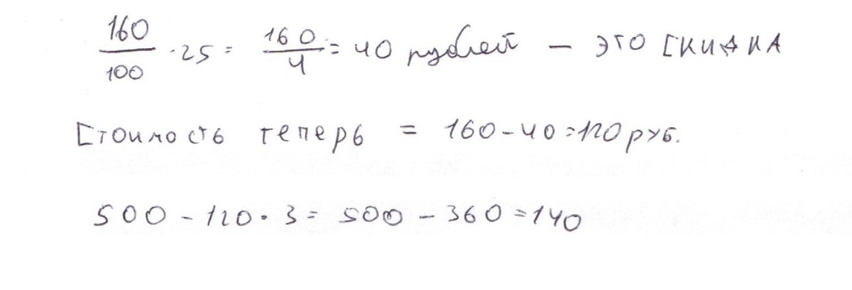 16 Набор фломастеров, который стоил 160 рублей, продаётся с 25%-й скидкой. При покупке трёх таких наборов покупатель отдал кассиру 500 рублей. Сколько рублей сдачи он должен получить?