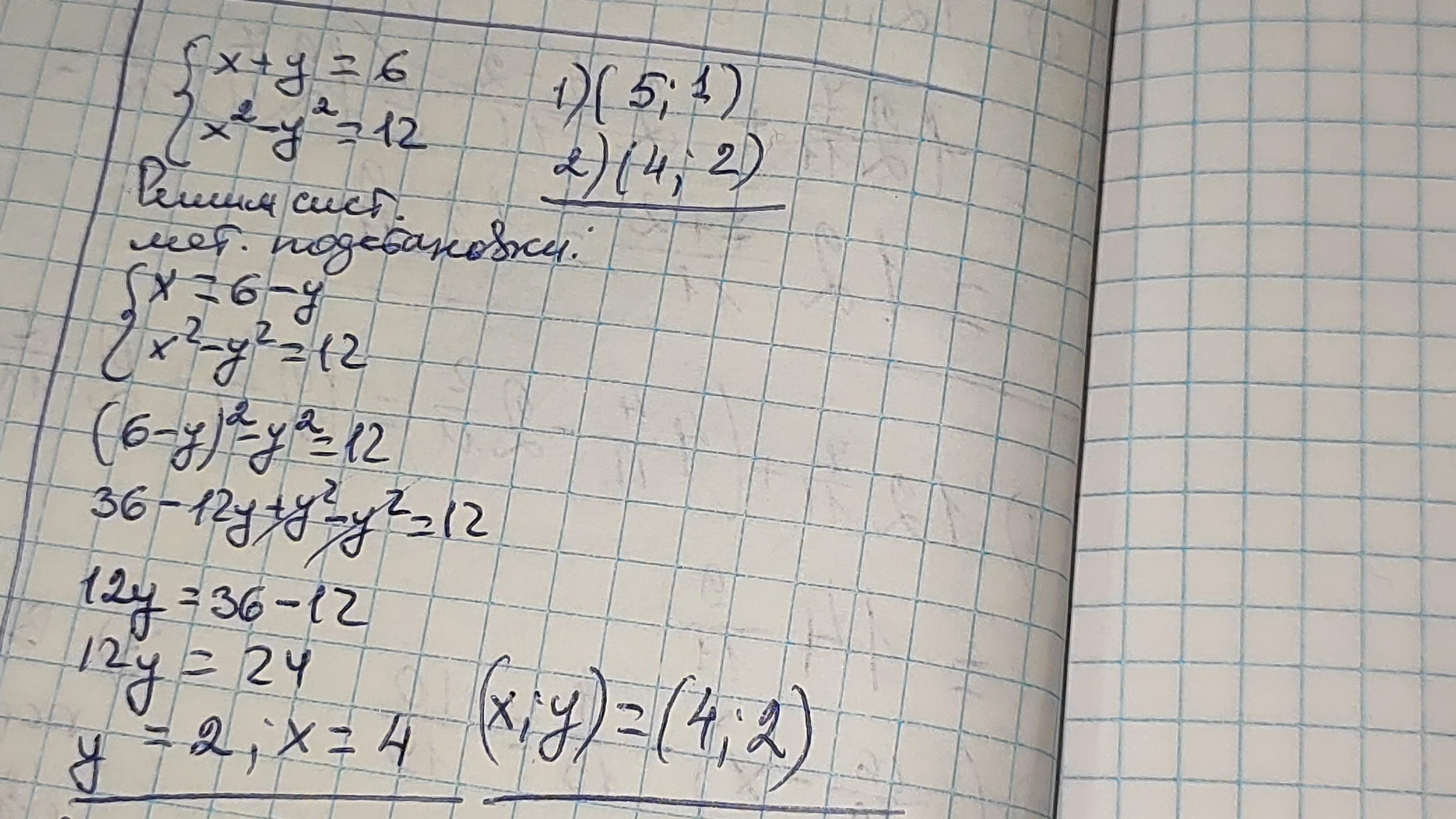Срочно(только с понятным объяснением)!!!Чи є розв'язком системи {x+y=6, x2-y2=12 пара чисел: 1) (5;1); 2) (4;2)