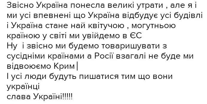 Ответ: Мені часто доводиться чути запитання: якою я бачу майбутню Україну? Коли вже закінчиться період переходу від радянської дійсності?Якою могла б бути відроджена Україна, можна обговорювати. Можна теж роздумувати, якою вона повинна бути. Але не так легко сказати, якою вона буде. Автор цих рядків не сумнівається, що Українська Держава після довгих періодів поневолення, після завзятих змагань і багатьох жертв таки буде. Та якою вона буде? Якщо слухати політиків-популістів, то вона буде такою, що кращої собі годі уявити. Одначе якщо об’єктивно оцінити те, що чинять відповідальні особи, то дочекаємося, навпаки, чогось дуже малого.Якою буде наша рідна Україна – залежить від нас, від кожного з нас. Що маю на думці? Усе залежить від того, скільки добра ми бажаємо всім громадянам нашої Батьківщини і скільки зусиль готові докласти, щоб те всенародне благо стало дійсністю. Не милозвучні слова, а конкретні позитивні вчинки – це основа відповіді на поставлене запитання. Іншими словами: Україна буде такою, якою ми її зробимо. Хочу підкреслити – ми, усі ми, на служінні правди, добра і краси.Кожний громадянин повинен старатися якнайкраще виконувати свої завдання. При цьому слід пам’ятати, що кожний із нас також неповторний і має особливі таланти: те, що може зробити одна особа, не зробить за неї ніхто інший. Отже, якщо людина не виконає свого життєвого завдання, не зробить того, що тільки вона може зробити, то це завдання буде не виконаним. Цю думку прекрасно сформулював наш поет Іван Франко: "Кожний думай, що на тобі мільйонів стан стоїть, що за долю мільйонів мусиш дати ти одвіт".Тож шановні й дорогі брати і сестри, хоч би ким ми були, виконуймо своє життєве завдання, здійснюймо те добро, якого прагнемо для себе і для всіх. І тоді Україна нашого майбутнього буде для нас справжньою Батьківщиною.Усе сказане вище цілком самозрозуміле. Хтось зауважить, що це все теорія суспільного життя, з якою важко не погодитися. Проте шановні й дорогі читачі, я готовий проілюструвати (принаймні в загальному) практичний бік наших змагань, бо завжди існує та небезпека, що ми, захопившись теорією, недобачаємо практики. Відразу хочу натякнути, що практика – це ми.Так сталося, що через несприятливі життєві обставини в нашому народі з’явився небувалий жертовний дух. Його носіями стали воїни-добровольці та волонтери. Відбулося те, чим справді можна захоплюватися. Але в цьому прихована певна небезпека: дивлячись на героїв, ми, пересічні громадяни, забуваємо про власну - може, не таку героїчну - роль у розбудові великої держави. Немає сумніву, що досягнення і служіння вищезгаданих жертовних людей дуже важливе і цінне для нашого дальшого розвитку.Однак, хочу наголосити, це не все. Крім них, майбутню Україну, якою будемо пишатися, мусять будувати також і так звані пересічні громадяни. Хто вони, наведу кілька прикладів: суддя, який пильно захищає права громадян; сумлінний поліцейський, який дбає про безпеку громадян; викладач, який заохочує студентів до інтелектуальної роботи; вчителька, яка дає відчути учням, які вони для неї важливі та які їй дорогі; працівник міської ради, який сумлінно готує потрібні документи для співгромадян; підприємець, який використовує тільки якісну сировину для приготування продовольчих продуктів; водій, який належно готується сам і готує свій тра