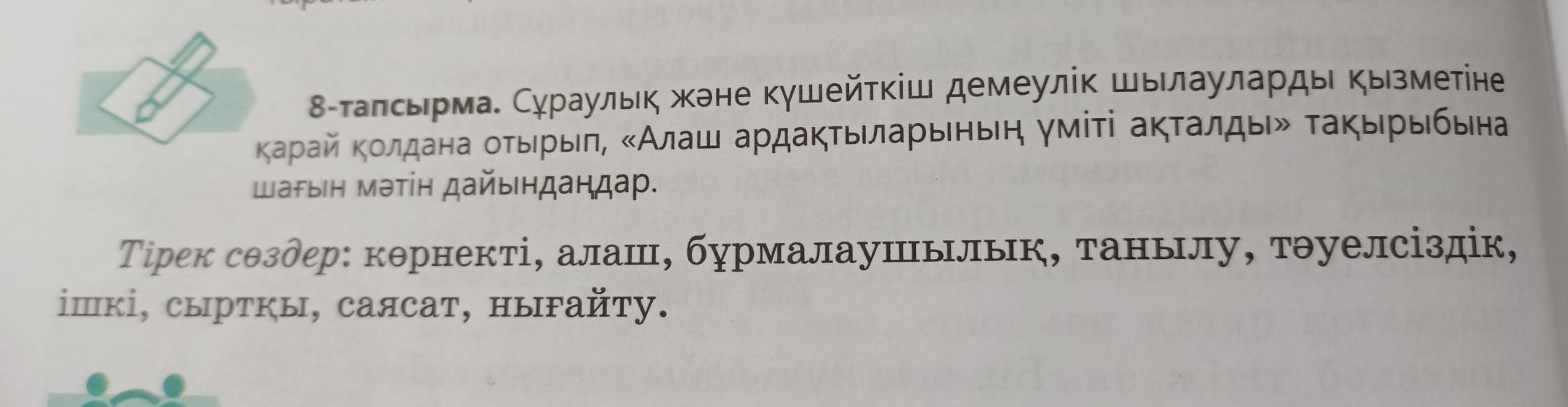 8-тапсырма.Сұраулық және күшейткіш демеулік шылауларды қызметіне қарай қолдана отырып, «Алаш ардақтыларының үміті ақталды» тақырыбына шағын мәтін дайындаңдар. Помогите!!