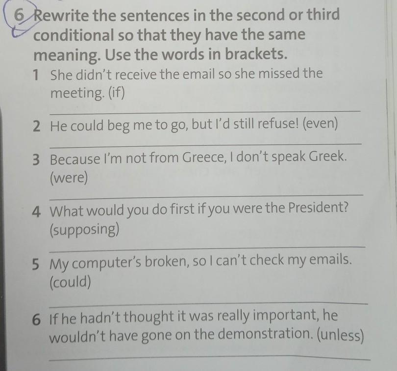 of al Rewrite the sentences in the second or third conditional so that they have the same meaning. Use the words in brackets. 1 She didn't receive the email so she missed the meeting. (if) 2 He could beg me to go, but I'd still refuse! (even) 3 Because I'm not from Greece, I don't speak Greek. (were) 4 What would you do first if you were the President? (supposing) 5 My computer's broken, so I can't check my emails. (could) 6 If he hadn't thought it was really important, he wouldn't have gone on the demonstration. (unless)