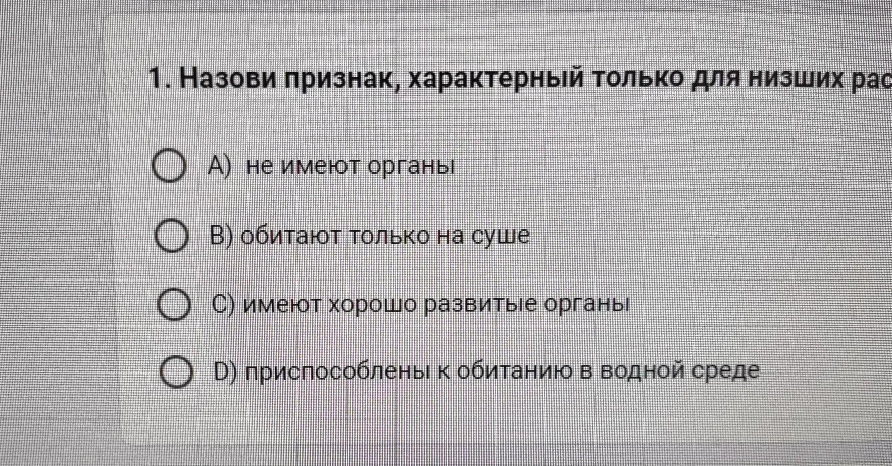 1. Назови признак, характерный только для низших растений 0 A) не имеют органы 0 B) обитают только на суше С) имеют хорошо развитые органы 0 D) приспособлены к обитанию в водной среде