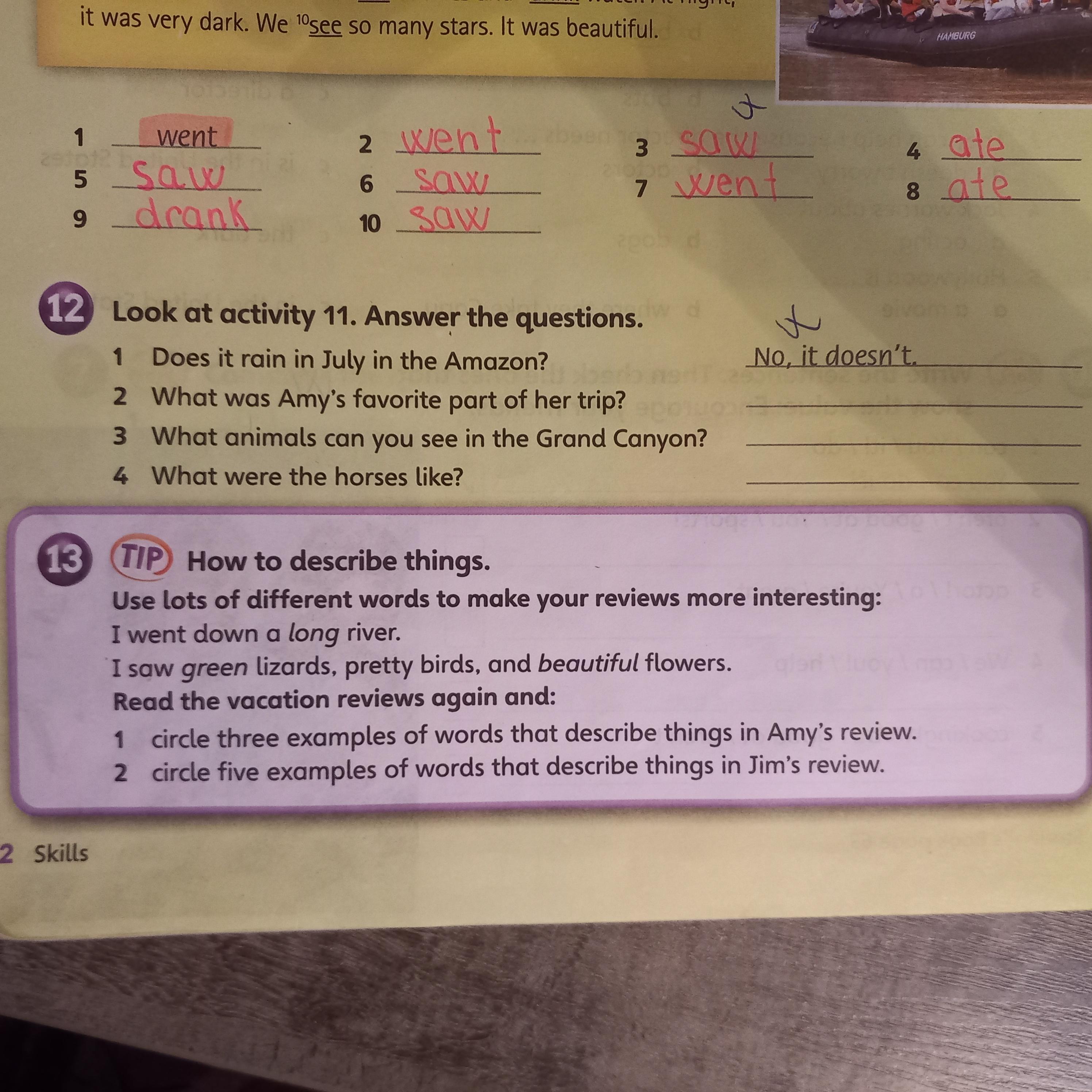 Ответ: 2. She saw a monkey and a jaguar 3. green lizards, pretty birds 4. They were naughty это на 12 задание, к 13 походу нужно другой материал прикрепить