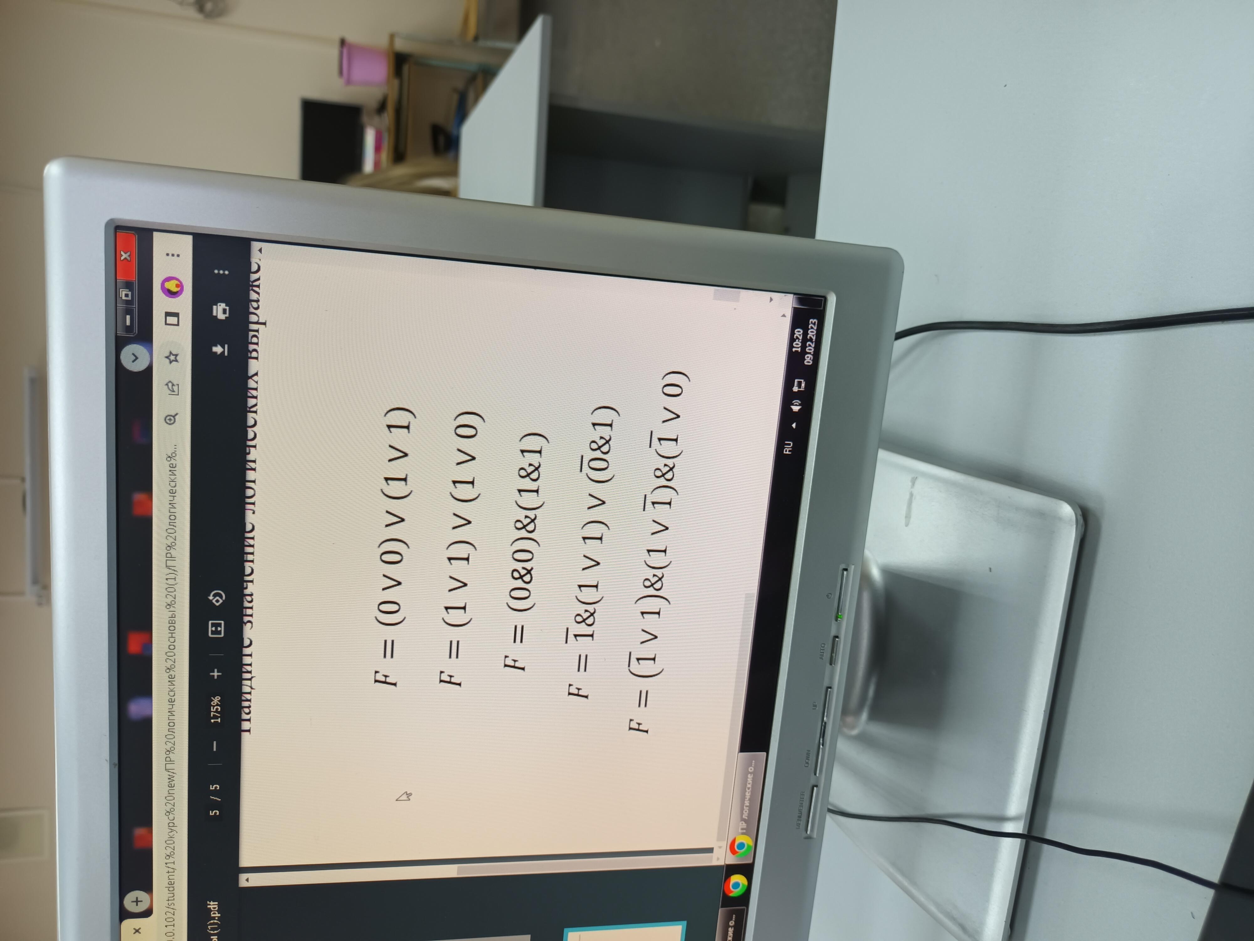 F = (полоска над цифрой 1 V 1) & (1 V полоска над цифрой 1) & (полоска над цифрой 1 V 0) = (0 V 1) & (1 V 0) & (0 V 0) = 1 & 1 & 0 = 0