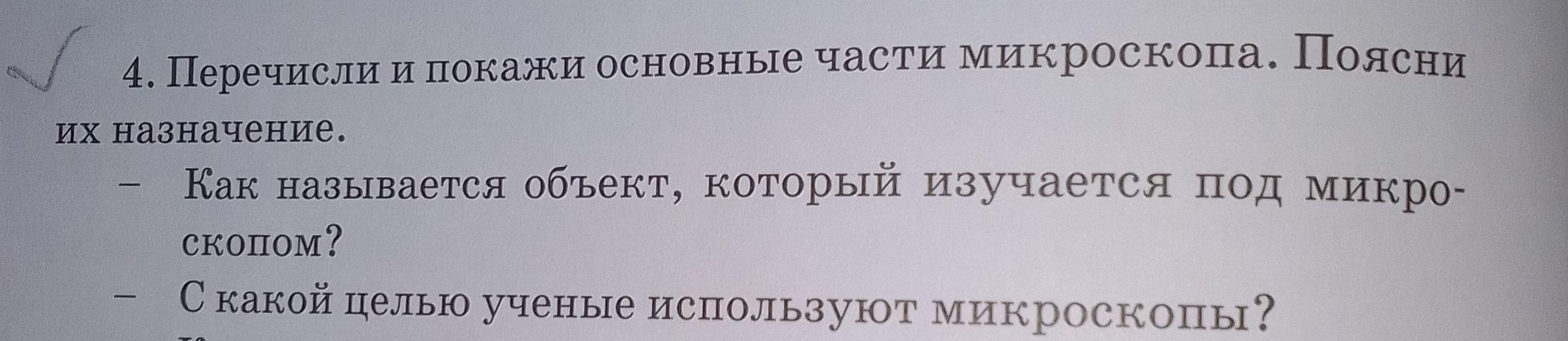 задние 4 ) Перечисли и покажи основные части микроскопа. Пояснил их назначение.