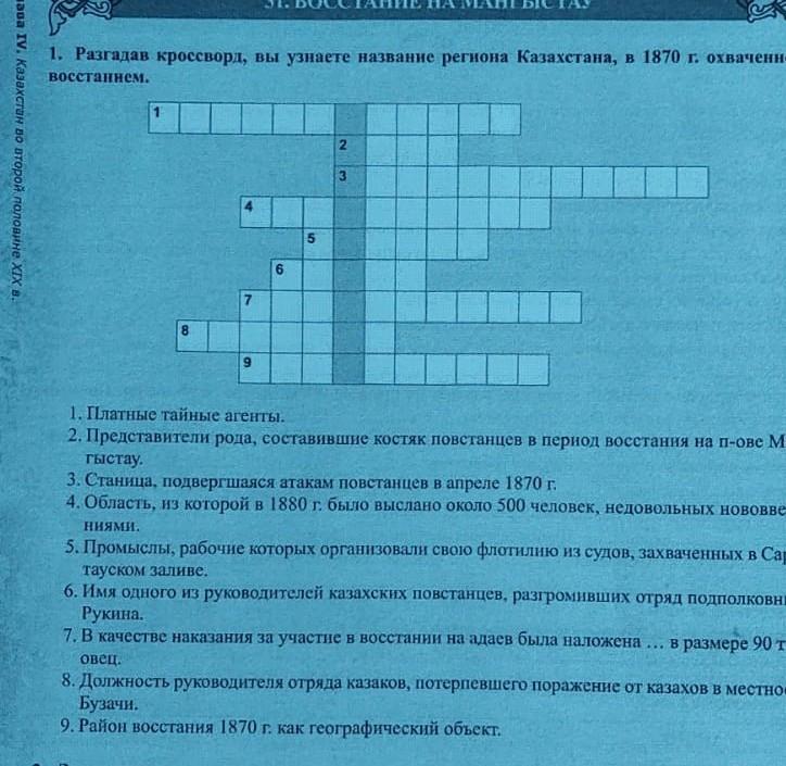 V. Казахстан во второй половине XIX 1. Разгадав кроссворд, вы узнаете название региона Казахстана, в 1870 г. охваченного восстаннем. 9 6 5 2 3 1. Платные тайные агенты. 2. Представители рода, составившие костяк повстанцев в период восстания на п-ове Ман- гыстау. 3. Станица, подвергшаяся атакам повстанцев в апреле 1870 г. 4. Область, из которой в 1880 г. было выслано около 500 человек, недовольных нововведе- ниями. 5. Промыслы, рабочие которых организовали свою флотилию из судов, захваченных в Сары- тауском заливе. 6. Имя одного из руководителей казахских повстанцев, разгромивших отряд подполковника Рукина. 7. В качестве наказания за участие в восстании на адаев была наложена овец. ... в размере 90 тыс. 8. Должность руководителя отряда казаков, потерпевшего поражение от казахов в местности Бузачи. 9. Район восстания 1870 г. как географический объект. 2. Заполните схему.