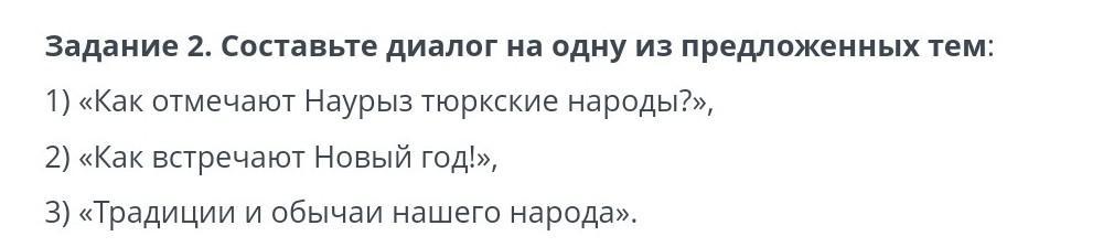 -Новый Год- это Наурыз. В Новый Год люди собираются и проводят разные мероприятия, например танцуют и поют. Также люди качаются на качелях Алтын Бакан, и наряжаются в национальные костюмы.