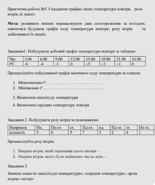 Практична робота №5. Складання графіка зміни температури повітря, рози вітрів, їх аналіз Мета: розвивати вміння опрацьовувати дані спостереження за погодою, навчитися будувати графік ходу температури повітря, розу вітрів здійснювати їх аналіз.( даю 40 балов срочно!!!)