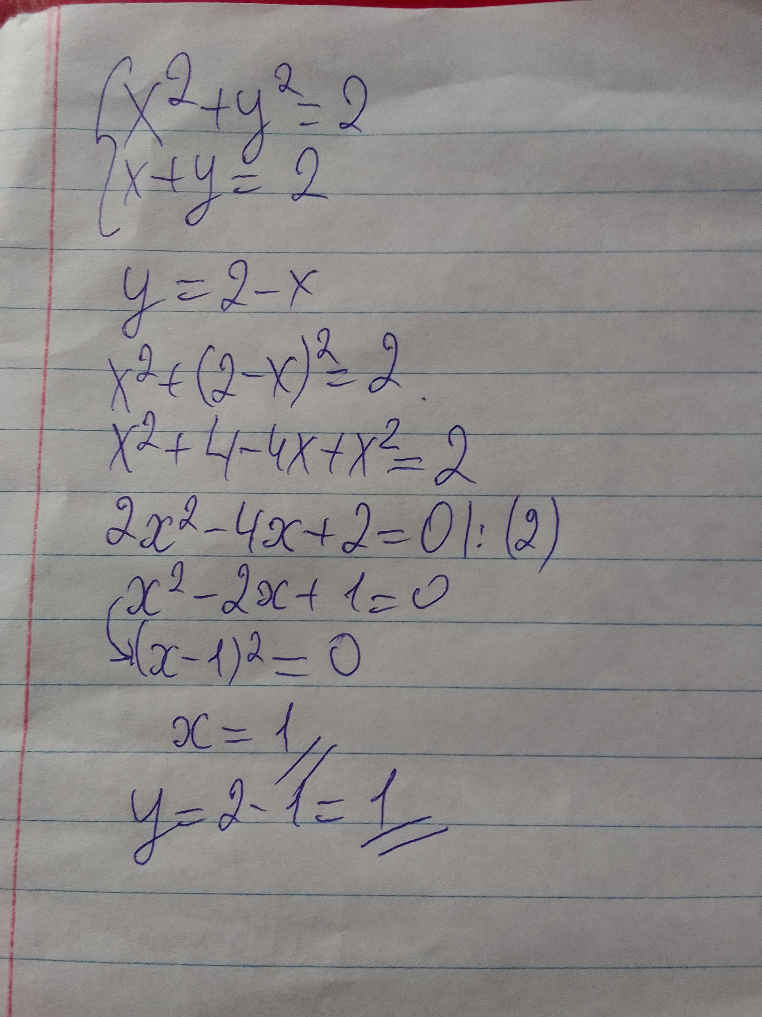 подставить вместо y в уравнении x²+y²=2,а затем в полученном уравнении x²+(2-х)²=2 посчитать (2-x)². Полученное квадратное уравнение поделить на два и представить как (x-1)²=0 и написать,что x=1 и в уравнении y=2-x подставить вместо x 1 и найти y.