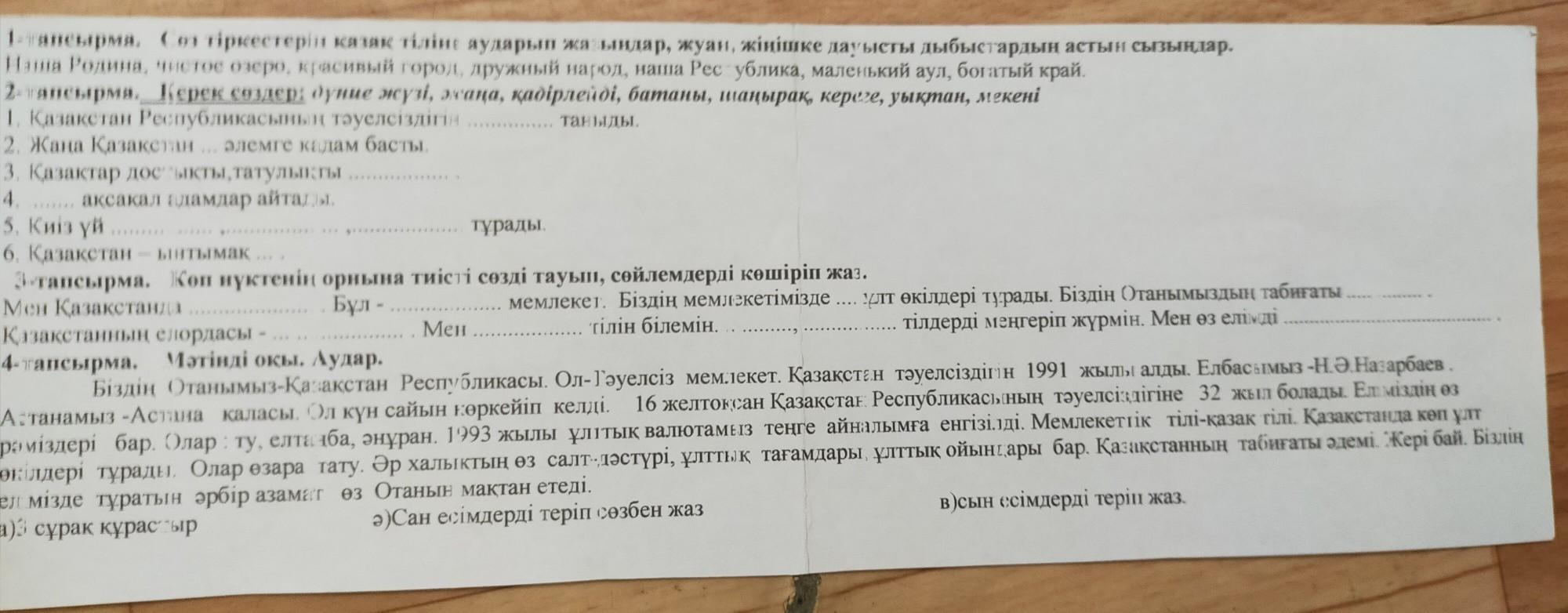 1тапсырма. Біздің Отанымыз, таза өзен, әдемі қала, мейірімді халық, біздің Республика, кішкентай ауыл, бай жер.