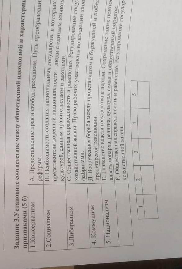 Задание 3. Установите соответствие между общественной идеологией и характернь признаками (5 б) 1. Консерватизм А. Предоставление прав и свобод гражданам. Путь преобразован 2.Социализм 3.Либерализм 4. Коммунизм 5. Национализм реформы. В представители коренной национальности В. Необходимость создания национальных государств, в которых культурой, единым правительством и законами. люди с единым языком С. Общественная справедливость и равенство. Регулирование госу хозяйственной жизни. Право рабочих участвовать во владении заво фабриками. пролетарской революции. Д. Вооруженная борьба между пролетариатом и буржуазией и побед E. Главенство власти государства и церкви. Сохранение таких ценнос власть монарха, религия, культура, семья и общественный порядок. F. Общественная справедливость и равенство. Регулирование государ хозяйственной жизни. 2 3 4 5