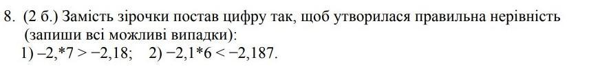 Замість зірочки постав цифру так, щоб утворилася правильна нерівність (запиши всі можливі випадки): 1)-2,*7>-2,18; 2)-2,1*6