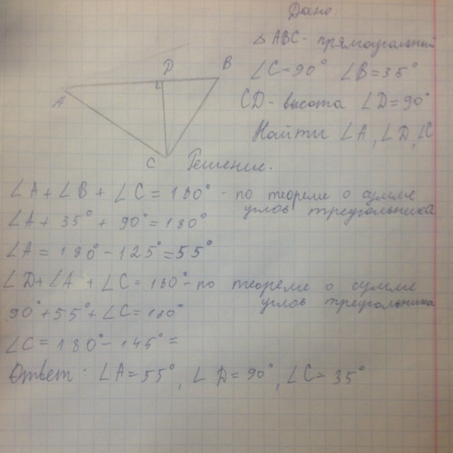 В треугольнике ABC угол C равен 90 градусов, а угол B равен 35 градусов, CD высота. Найдите углы треугольника ACD