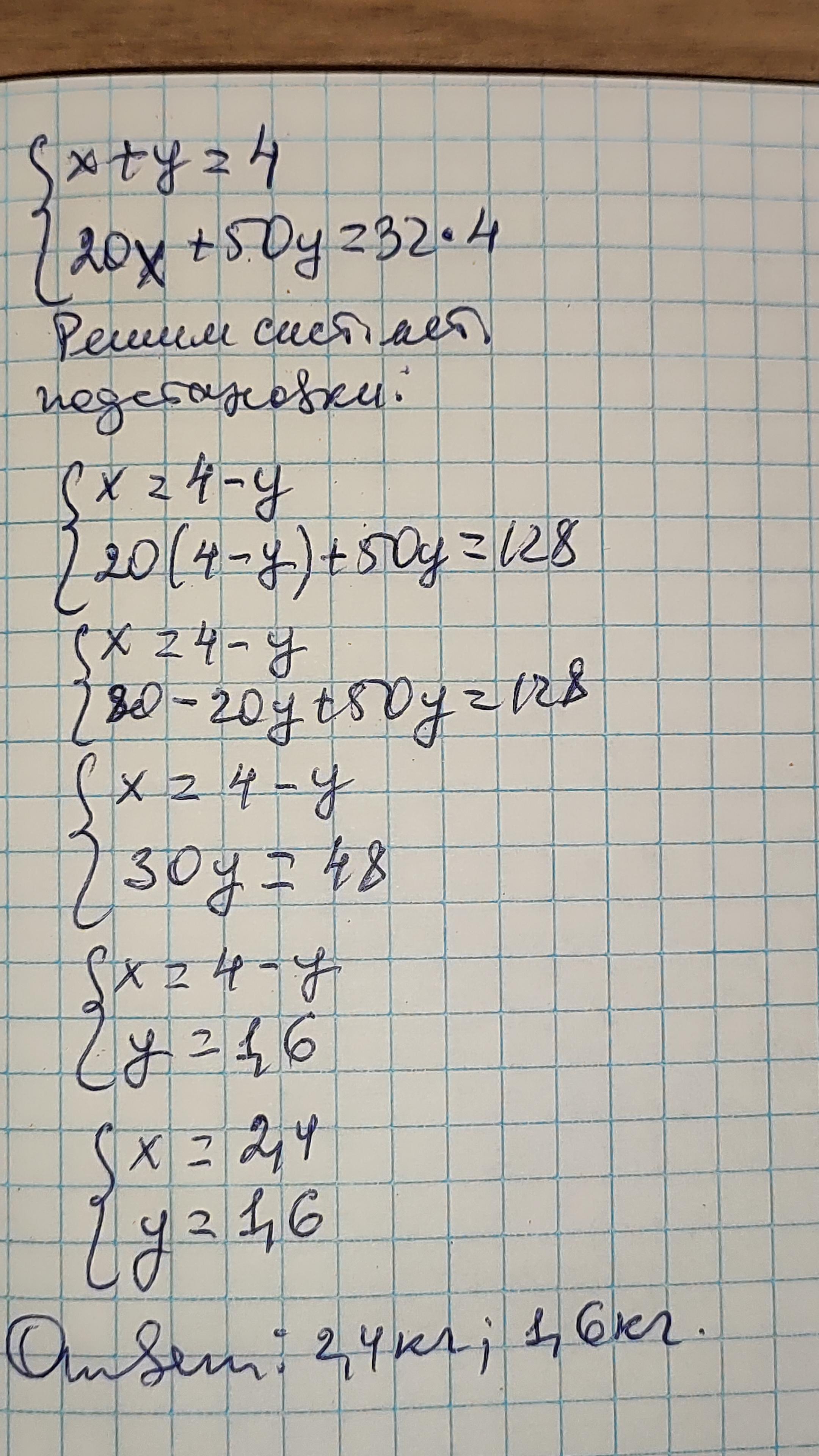 Розв'яжіть задачу за допомогою системи рівнянь. 1) Змішавши 20%-й і 50%-й розчини солі, отримали 4 кг 32%-го розчину солі. Скільки кілограмів кожного розчину було взято,